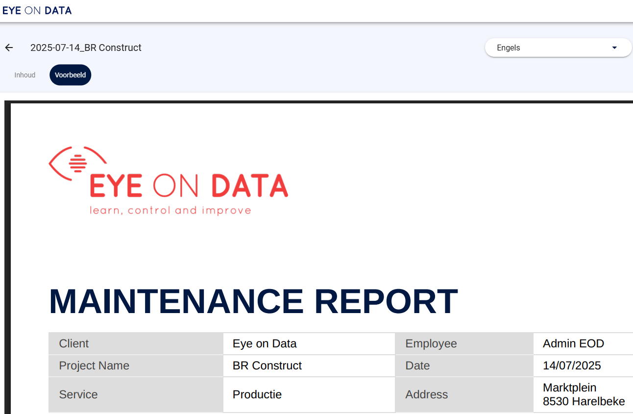 Duidelijke communicatie is de basis van goed onderhoud. Dankzij de meertalige rapportering van Eye on Data voorkom je misverstanden, bespaar je tijd en verhoog je de kwaliteit van je service – zeker op momenten waar snelheid en duidelijkheid cruciaal zijn, zoals tijdens het verlof of bij dringende interventies.